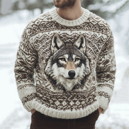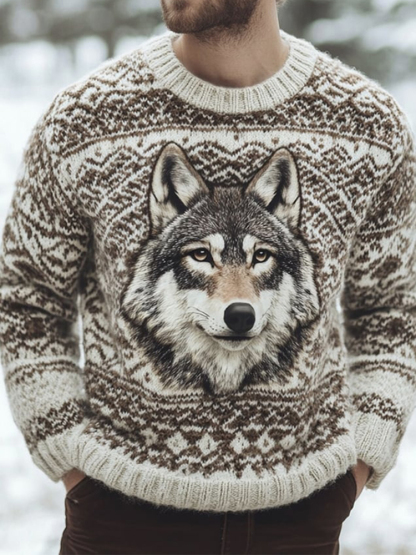 Vintage Men's Warm Wolf Pattern Crew Neck Sweater