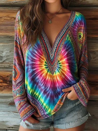 Women's Ethnic Geometric Tie-dye Print V-neck T-shirt