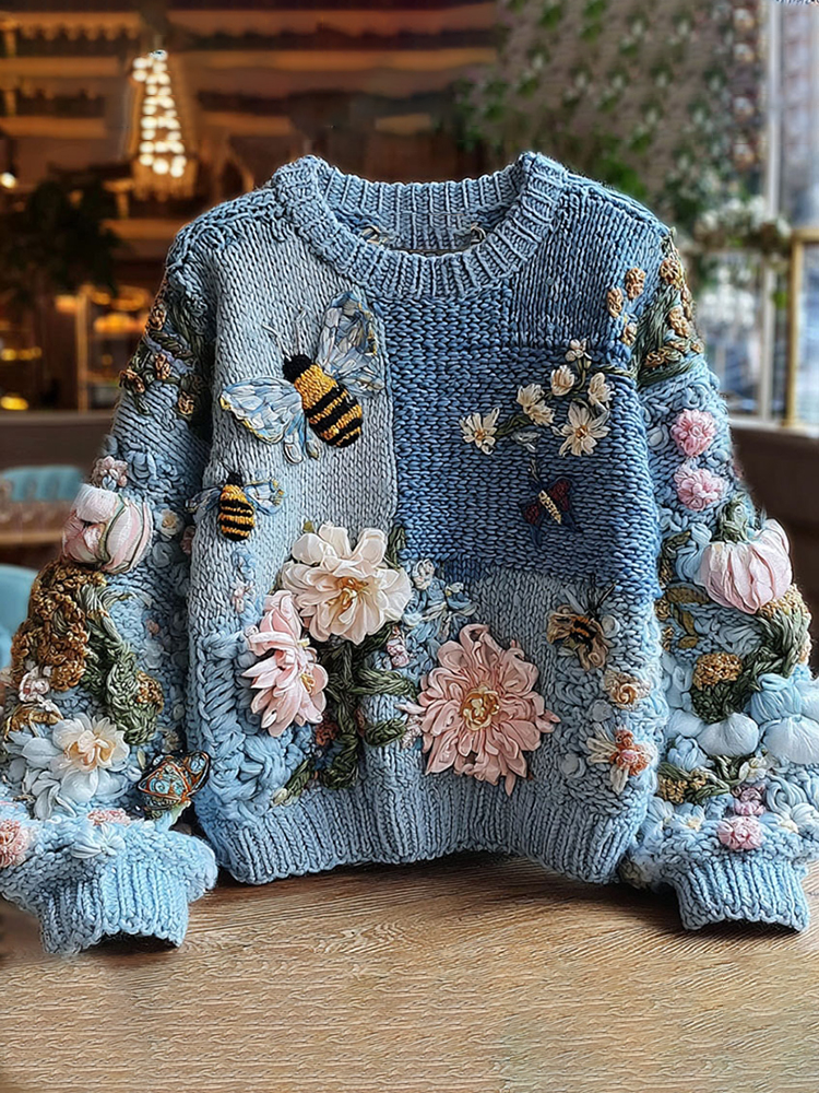 Women's Vintage Floral And Bee Embroidery Long Sleeve Cozy Sweater