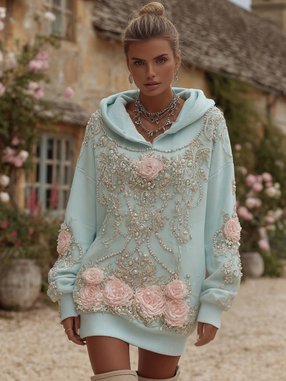 Women's Vintage Pink Rose Pearl Embroidery Pattern Cotton Long Hoodie