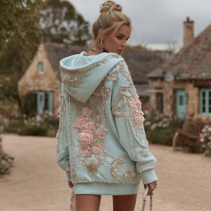 Women's Vintage Pink Rose Pearl Embroidery Pattern Cotton Long Hoodie