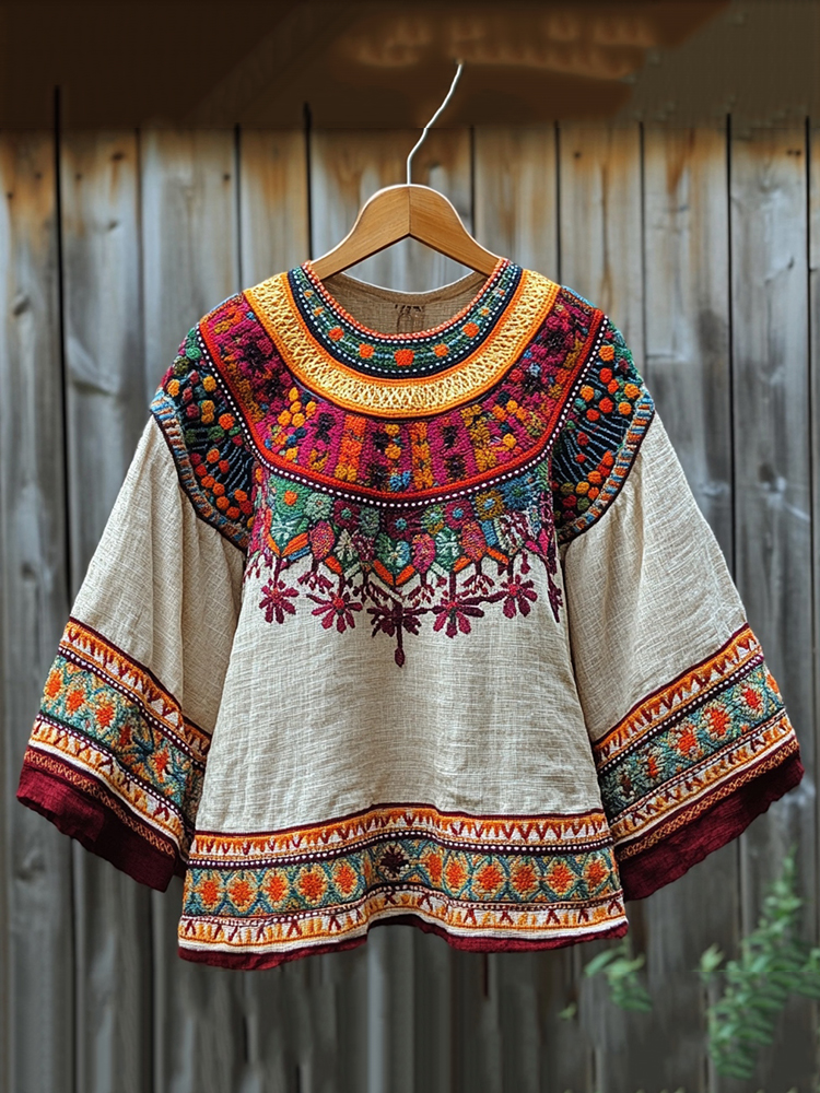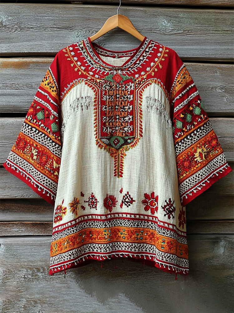 Women's Retro Greenland Ethnic Design Round Collar T-shirt