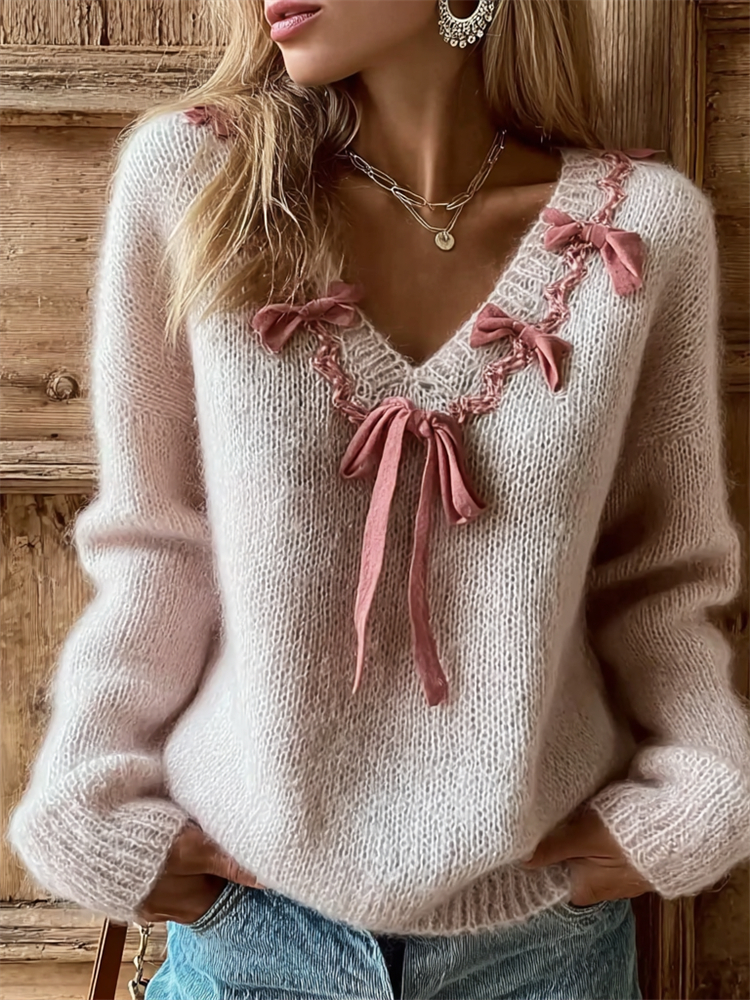 Vintage Bow Tie Pink Ribbon V Neck Cozy Sweater