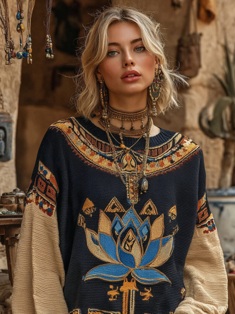 Women's Vintage Egyptian Egyptian Lotus Art Knit Pullover Sweater