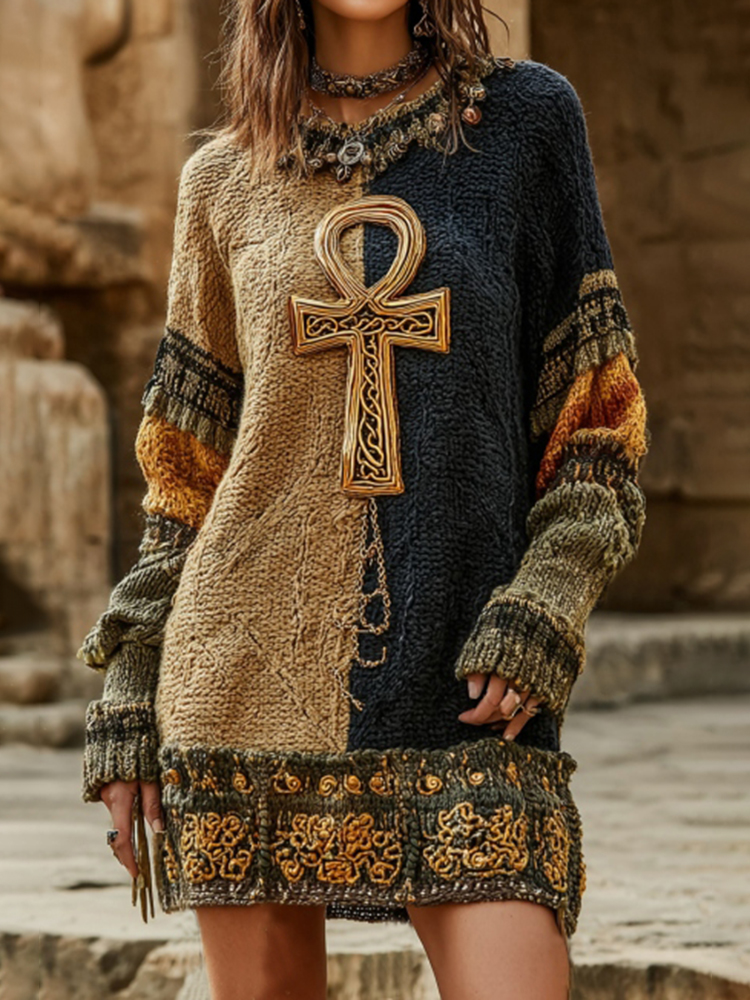 Women's Vintage Ancient Egyptian Ankh Pattern Cozy Knit Mini Sweater Dress