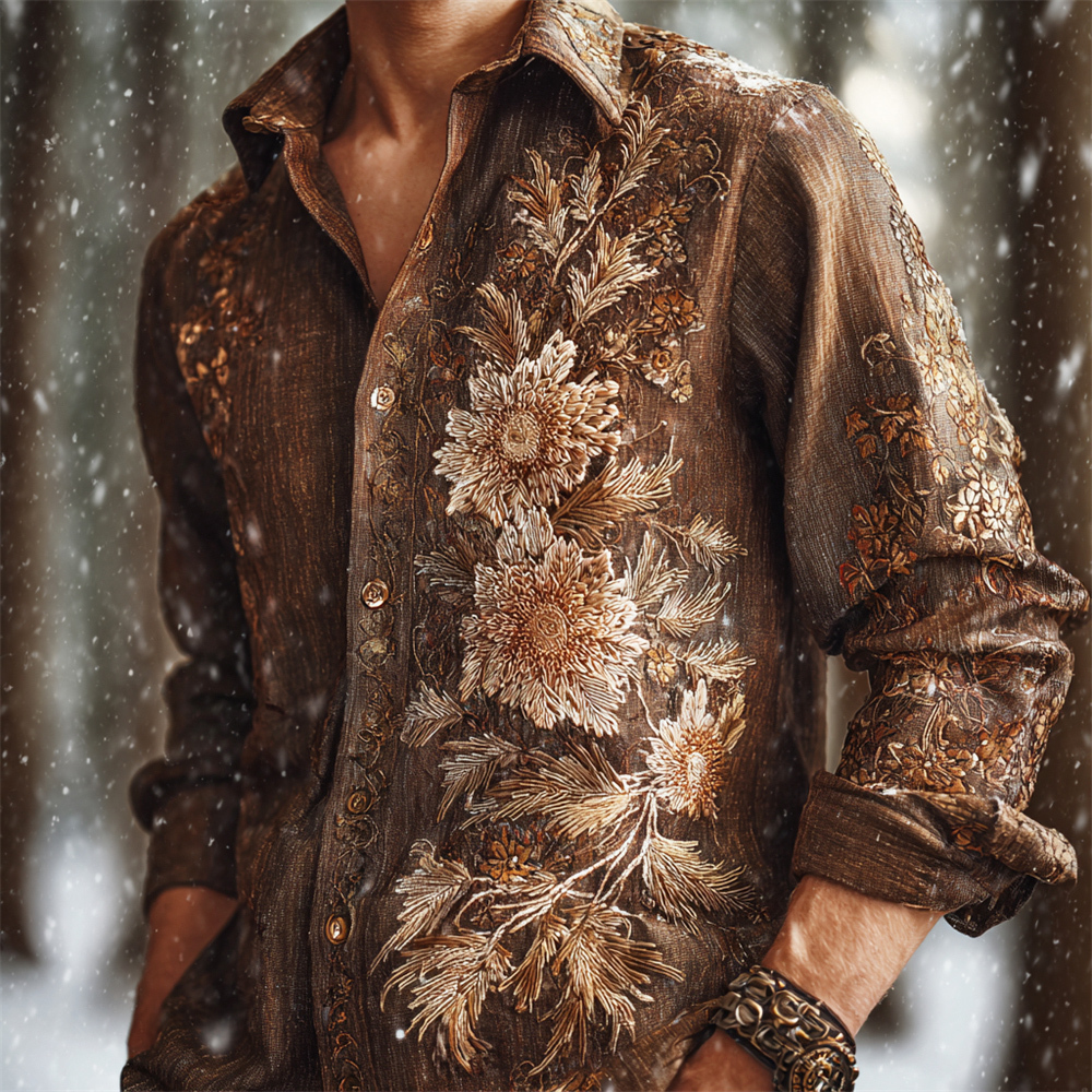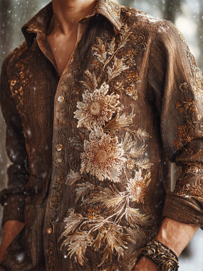 Japanese Chrysanthemum Embroidery Men's Linen Long Sleeve Shirt