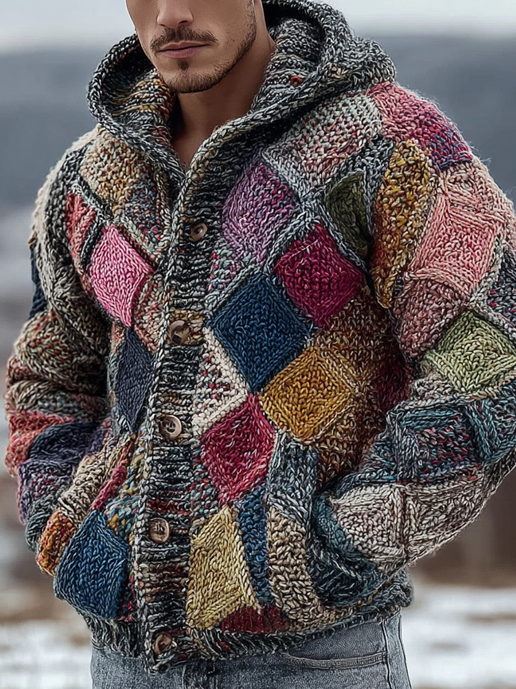 Men's Fair Isle Geometric Knit Jacquard Button Hooded Sweater