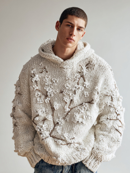 Men's Japanese White Almond Blossom Warm Hooded Sweater