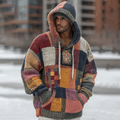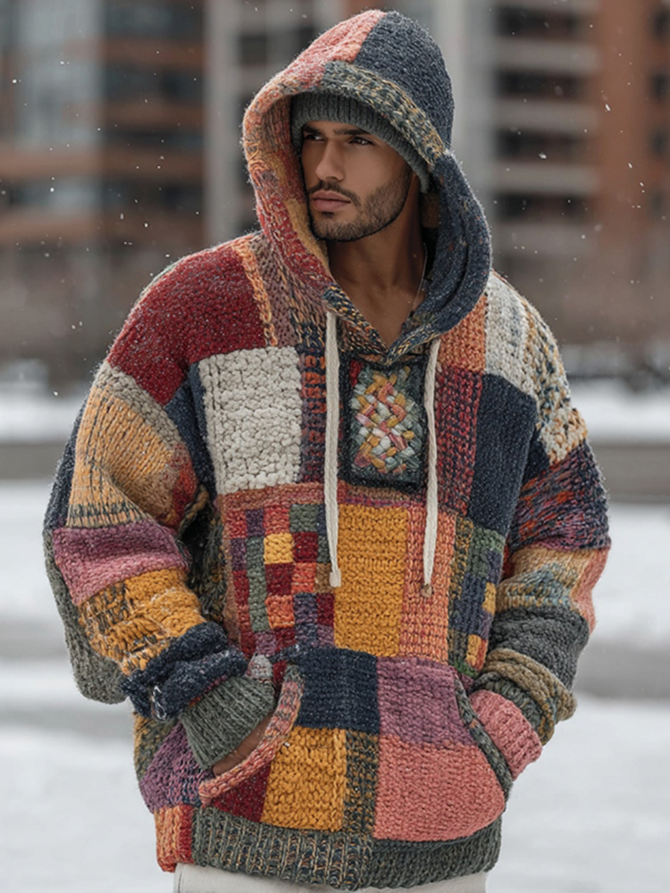 Men's Retro Tribal Geometric Pattern Knitted Jacquard Cozy Hooded Sweater