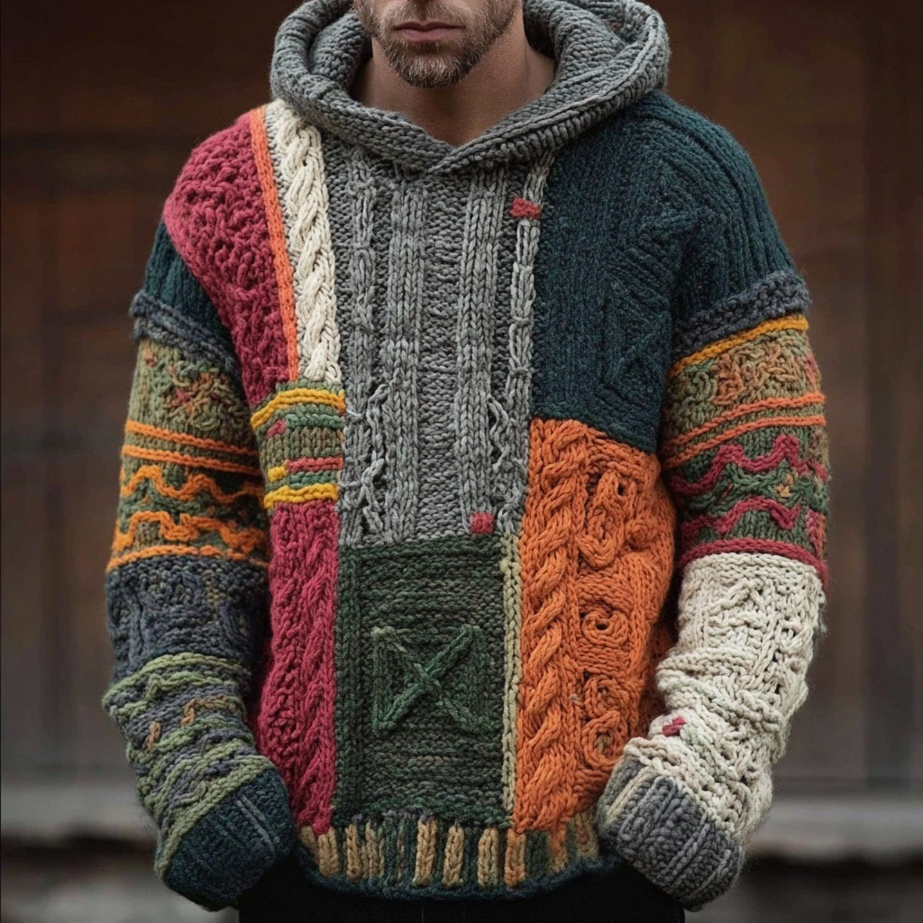 Men's Vintage Geometric Patchwork Cozy Hooded Sweater