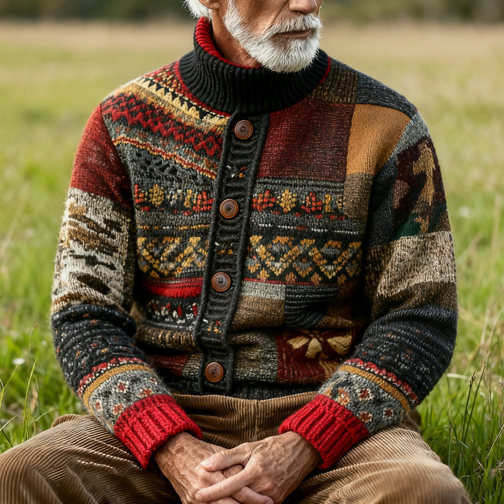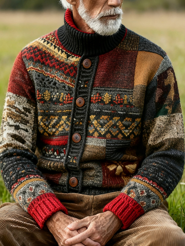 Men's Winter Retro Patchwork Printed Knitted Cardigan