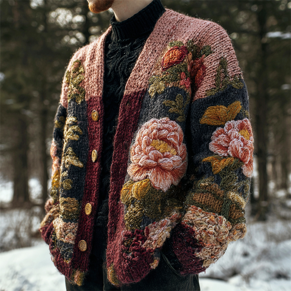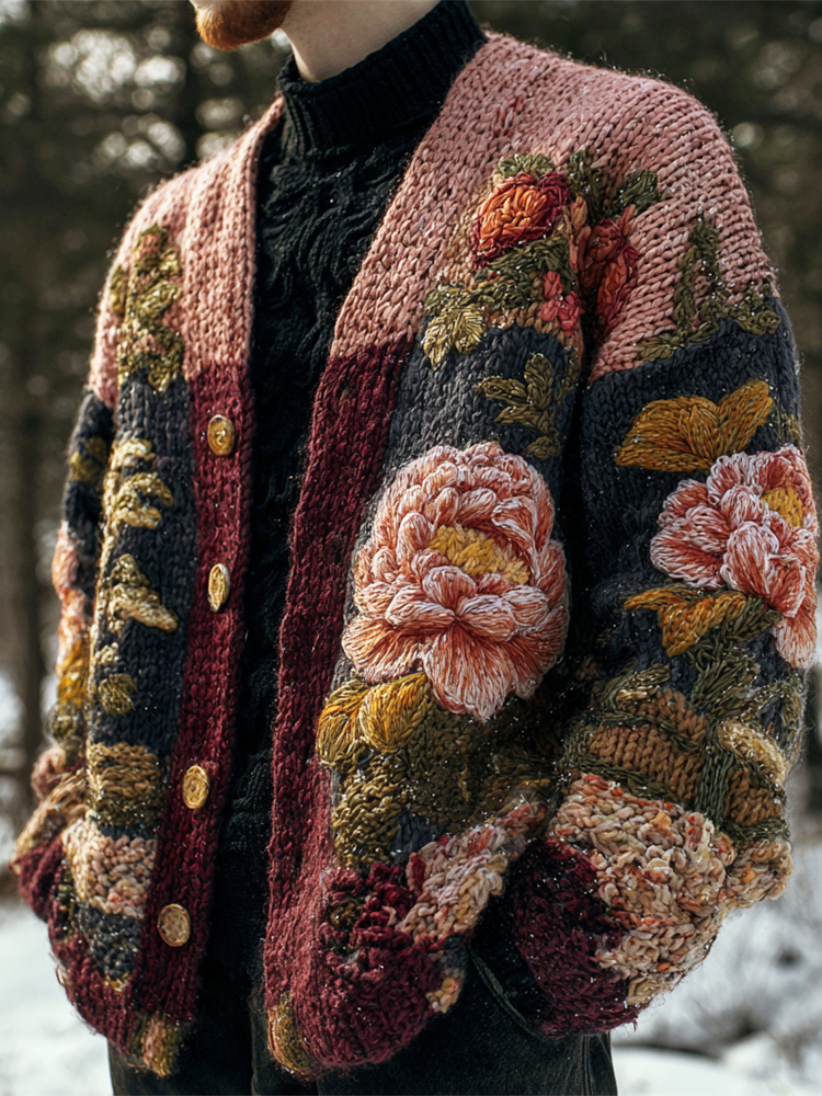 Vintage Japanese Chrysanthemum Embroidered Men's Knit Cardigan