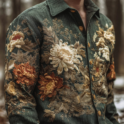 Vintage Japanese Chrysanthemum Embroidery Art Men's Linen Long Sleeve Shirt
