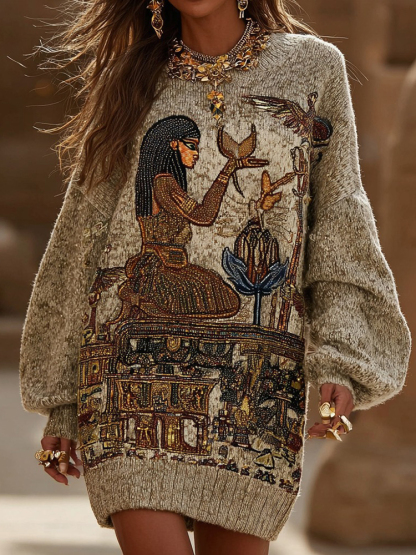 Women's Ancient Egyptian Art Warm Knit Mini Sweater Dress