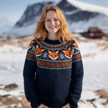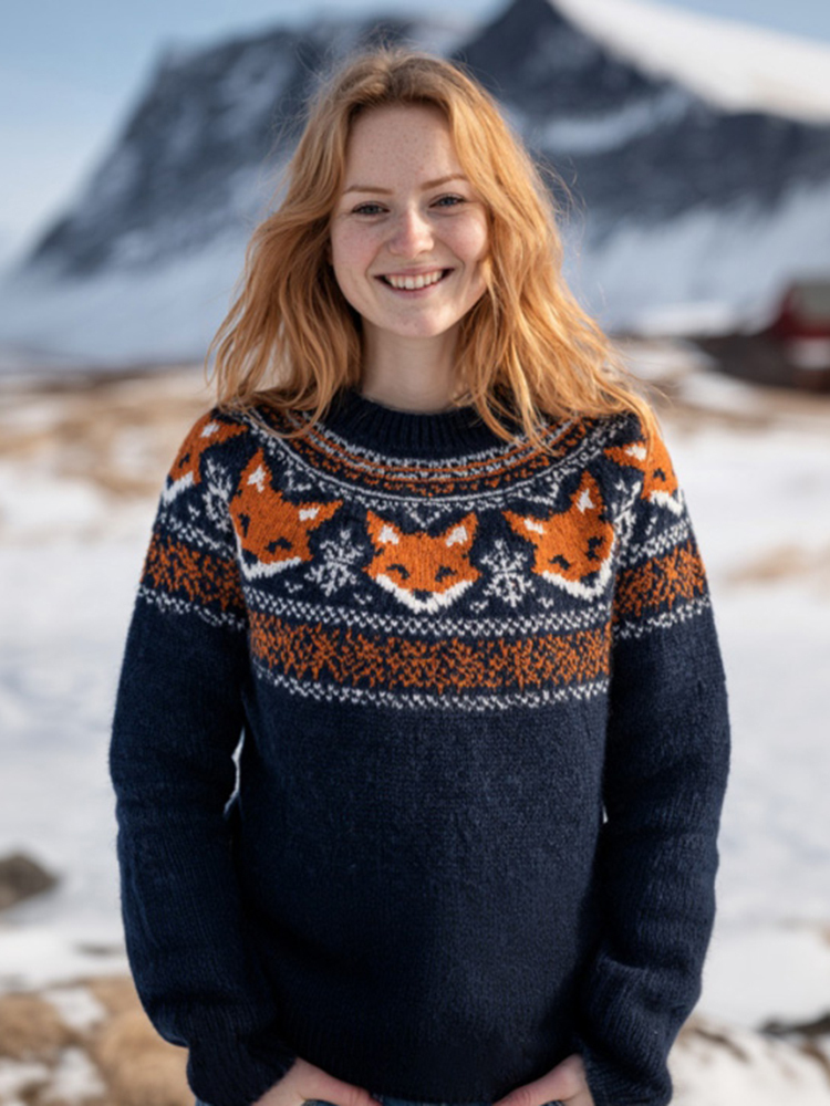 Women's Fox And Geometric Stripe Pattern Comfortable Crew Neck Sweater