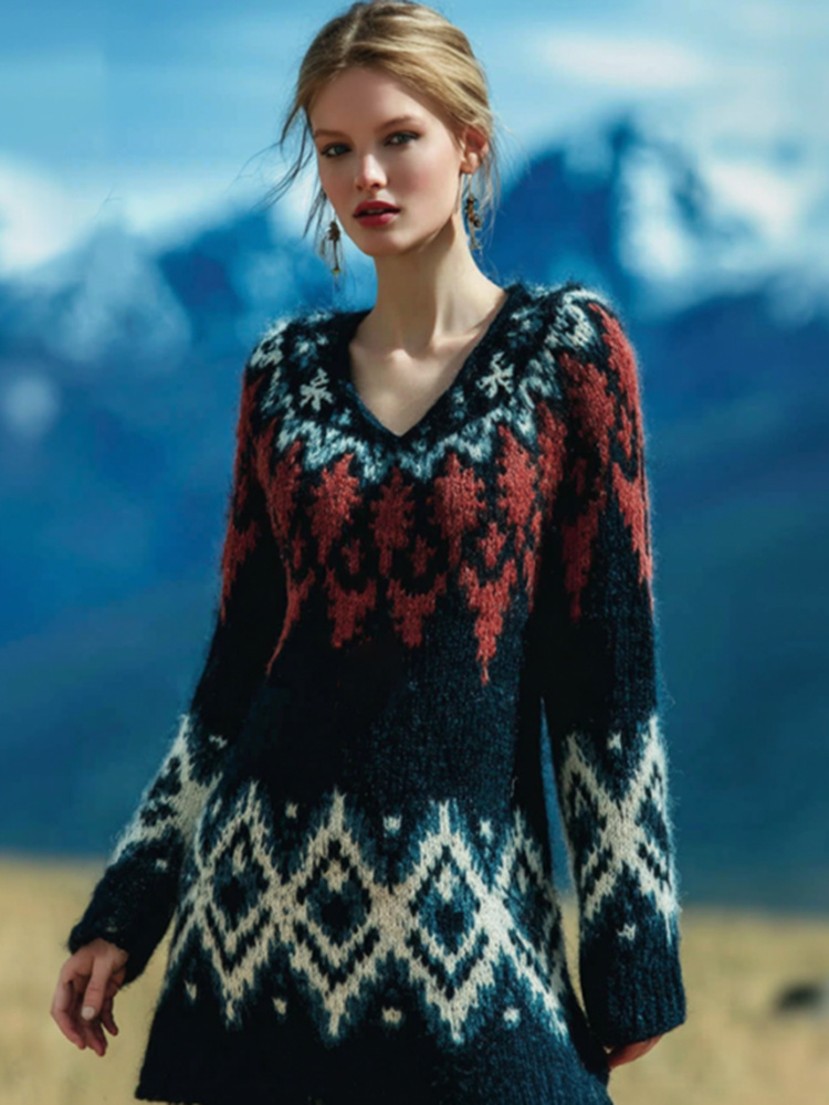 Women's Norwegian Icelandic Jacquard Cozy Knit V Neck Sweater Dress