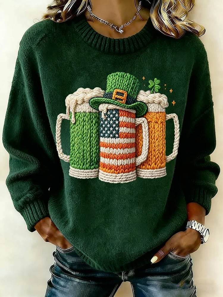 Women's St. Patrick's Day Shamrock Beer Art Printed Crew Neck Sweater