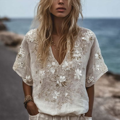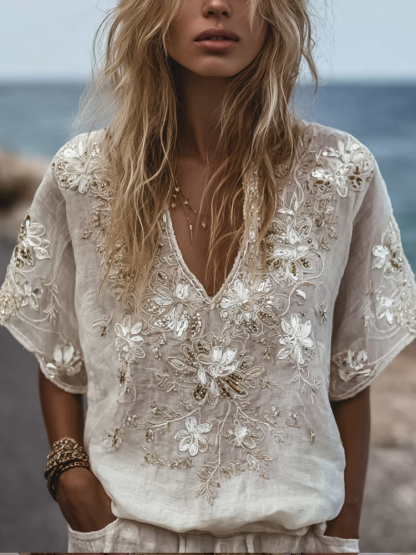 Women's White Flower V-neck Vintage Embroidery Short-sleeved Shirt