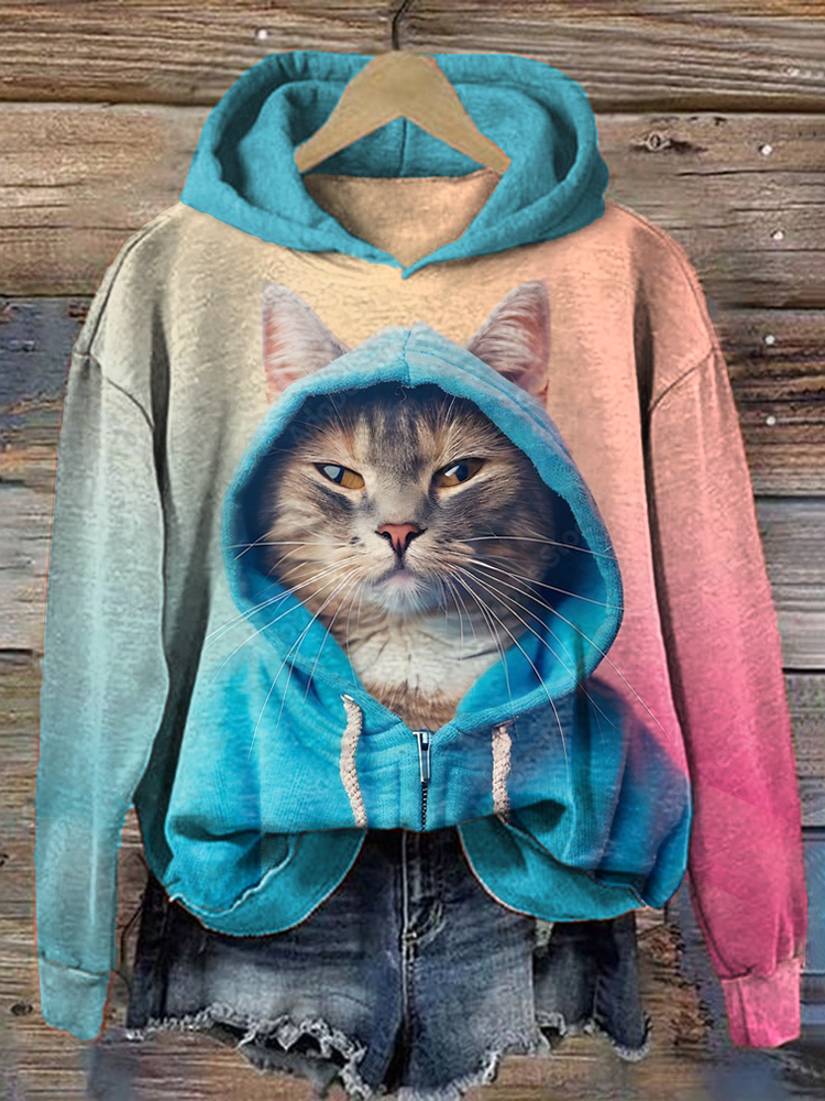 Cute Cat Art Print Contrast Color Cozy Hoodie