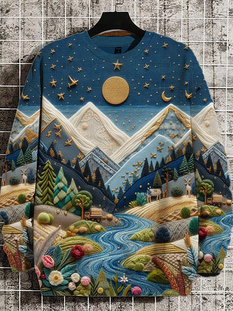 Men's Starry Sky Trees Mountains Embroidery Art Print Cotton Sweatshirt