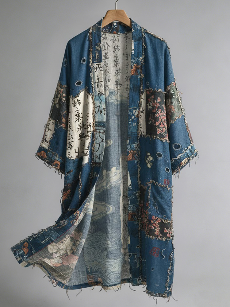 Men's Retro Japanese Patchwork Art Print Linen Long Kimono