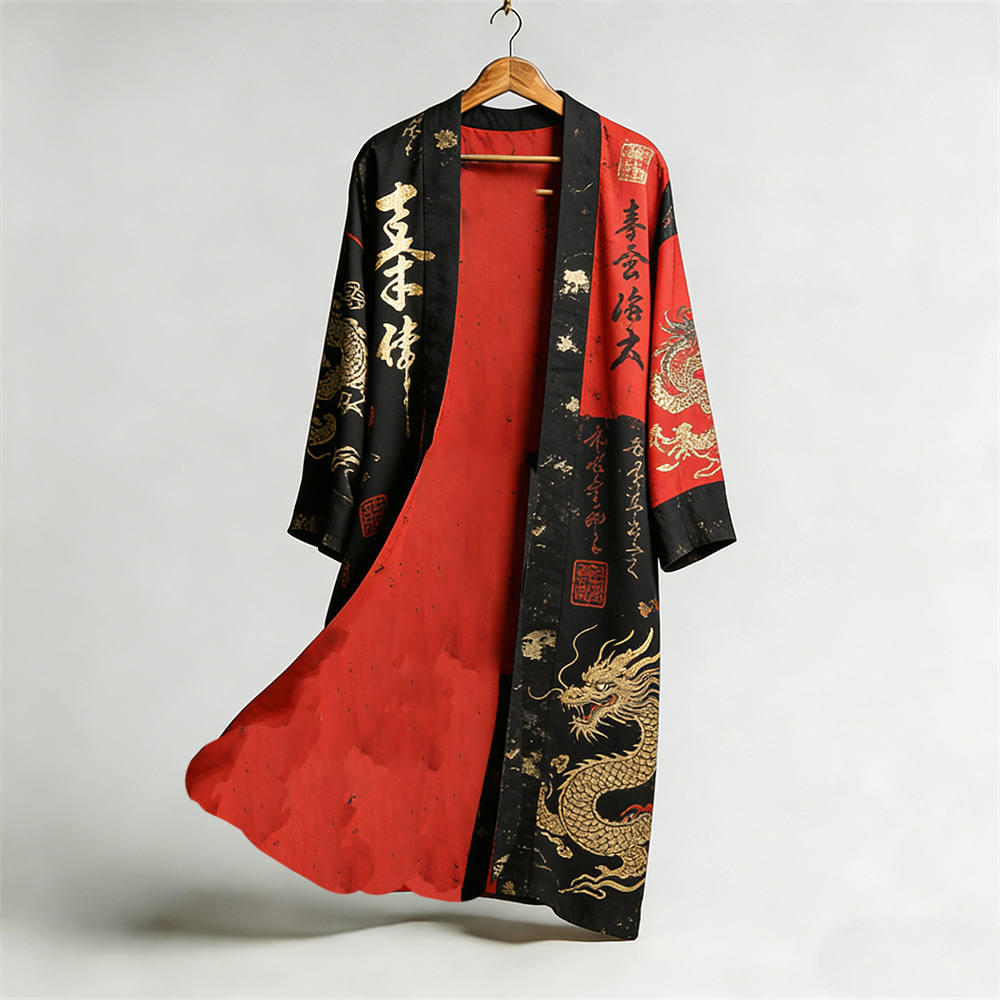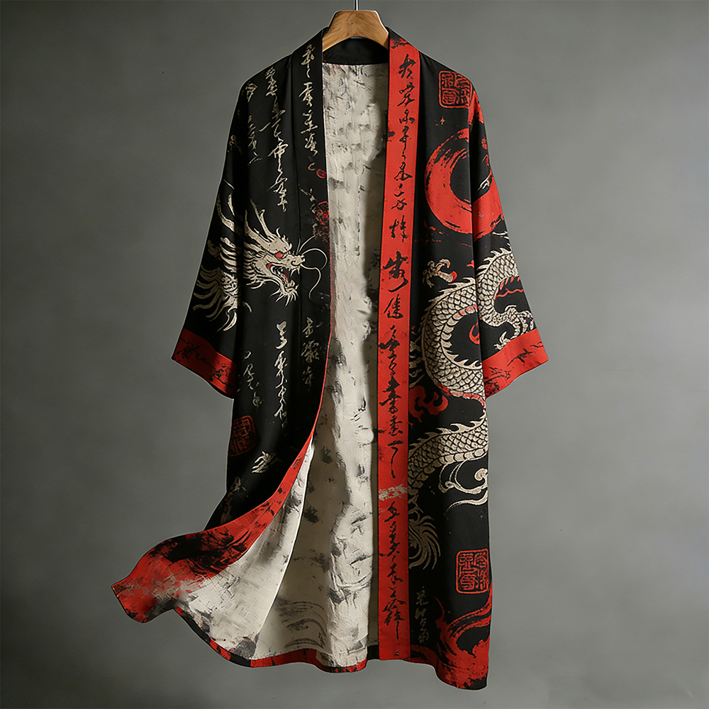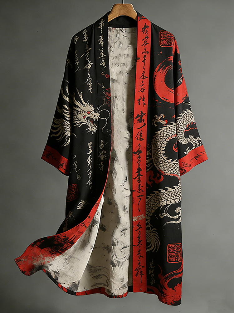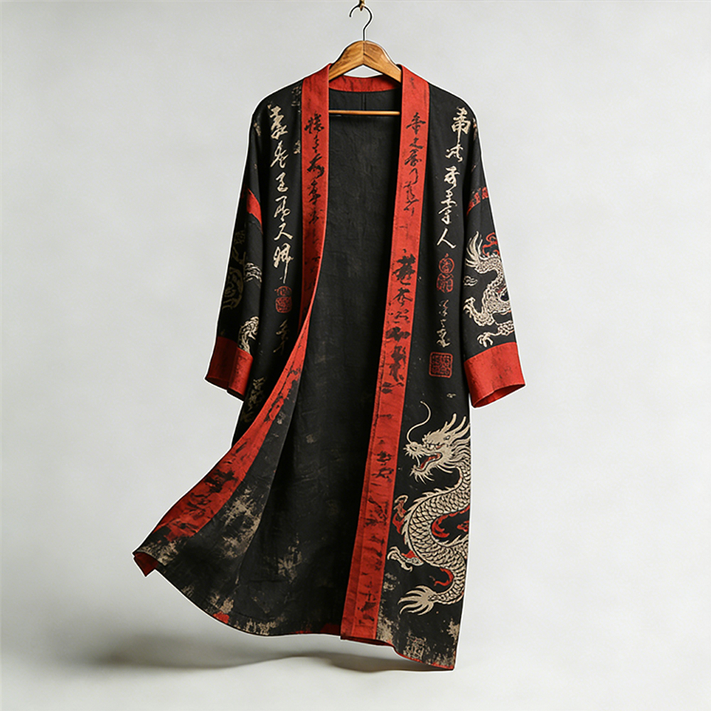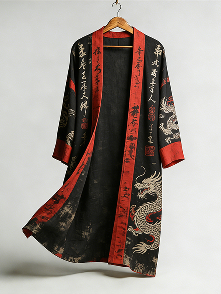 Men's Japanese Dragons Calligraphy Placket Linen Long Kimono