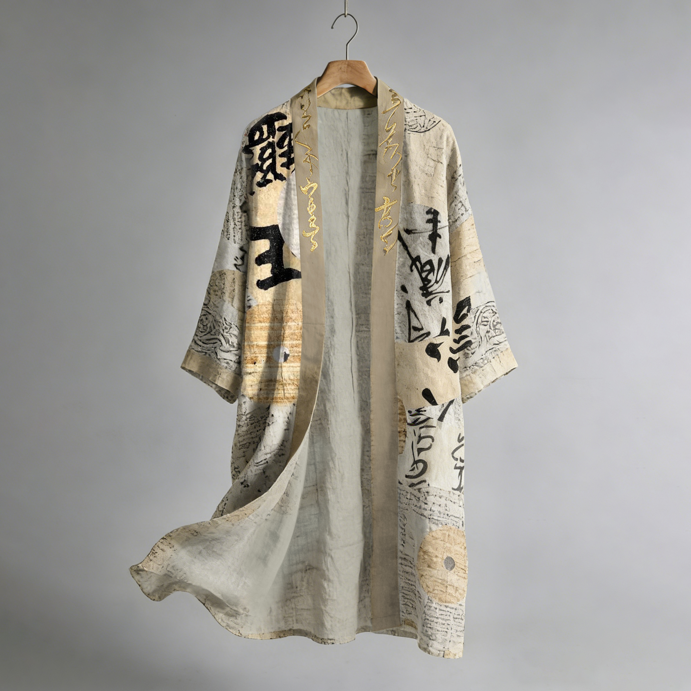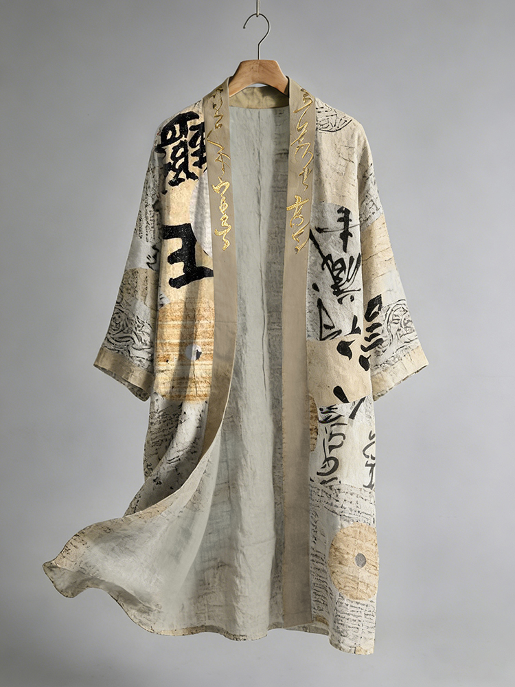Retro Patchwork With Calligraphy Pattern Casual Linen Blend Kimono