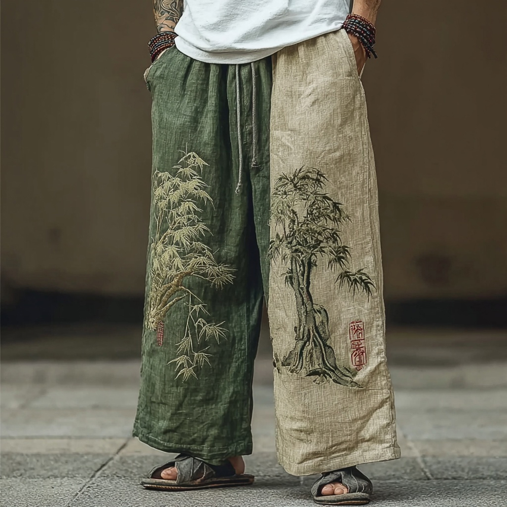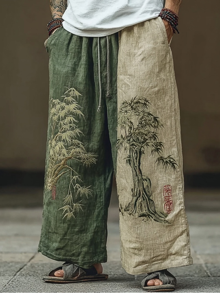 Men's Japanese Pine Trees Calligraphy Contrast Linen Pants