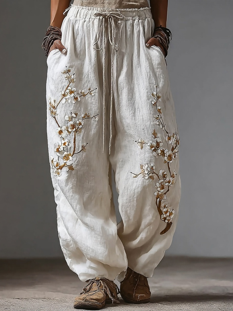 Men's Vintage Japanese White Plum Blossom Art Linen Trousers