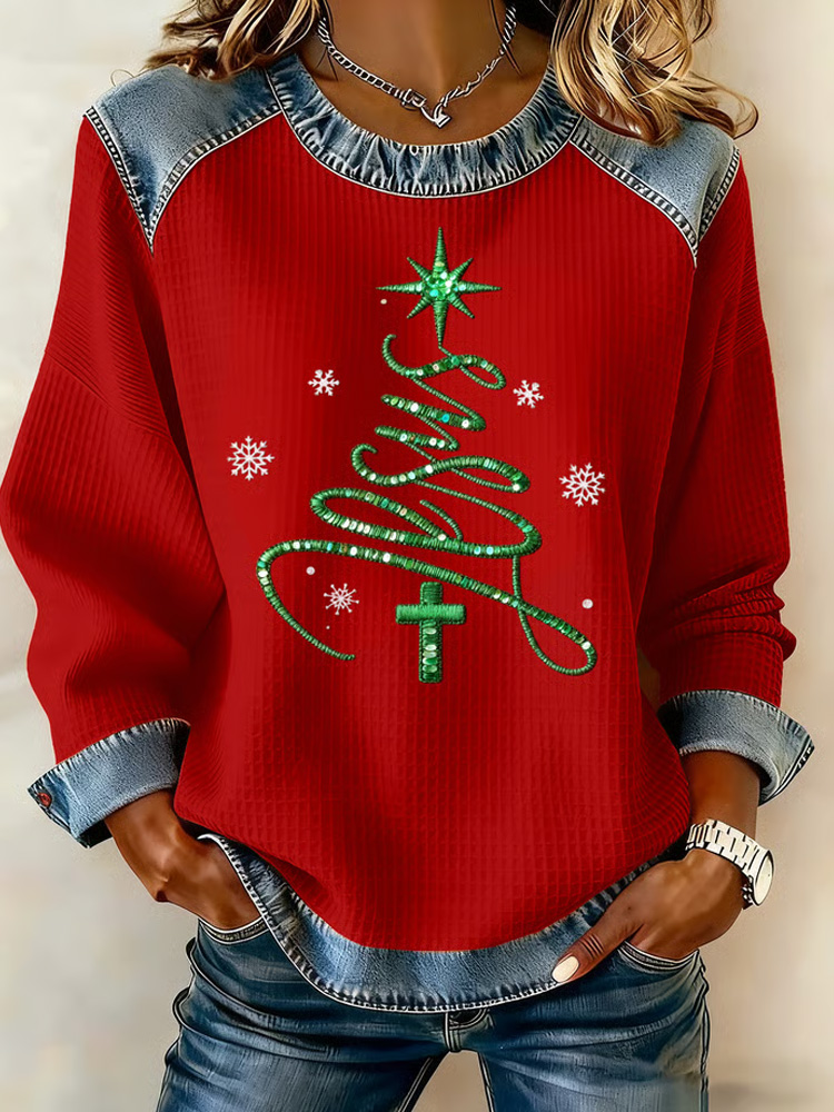 Women's Casual Christmas Waffle Patchwork Denim Sweatshirt