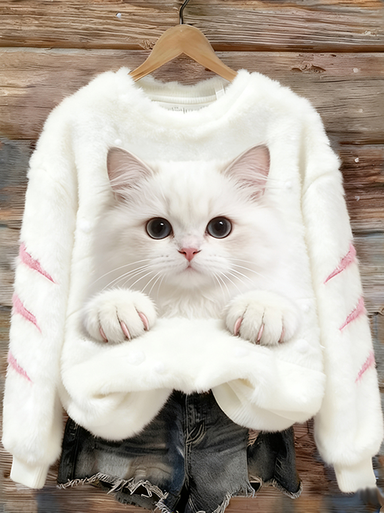 Cat-paw-showing Cat Warm Round-neck Flannel Hoodie
