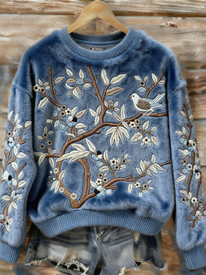 Birds & Flowers Art Round Neck Plush Sweatshirt