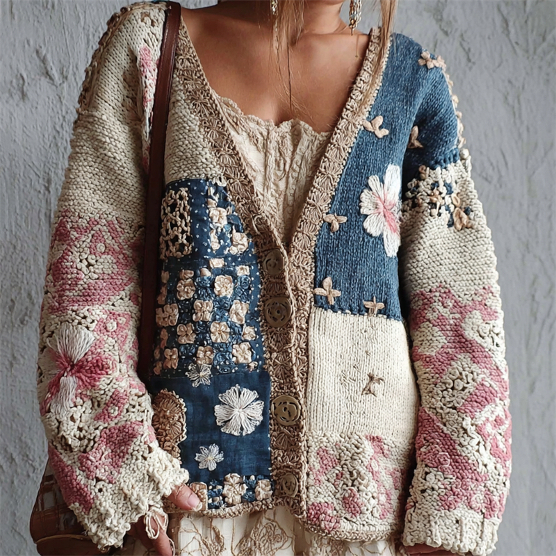 Cherry Blossom Japanese Sashiko Colorblock Cozy Knit Cardigan