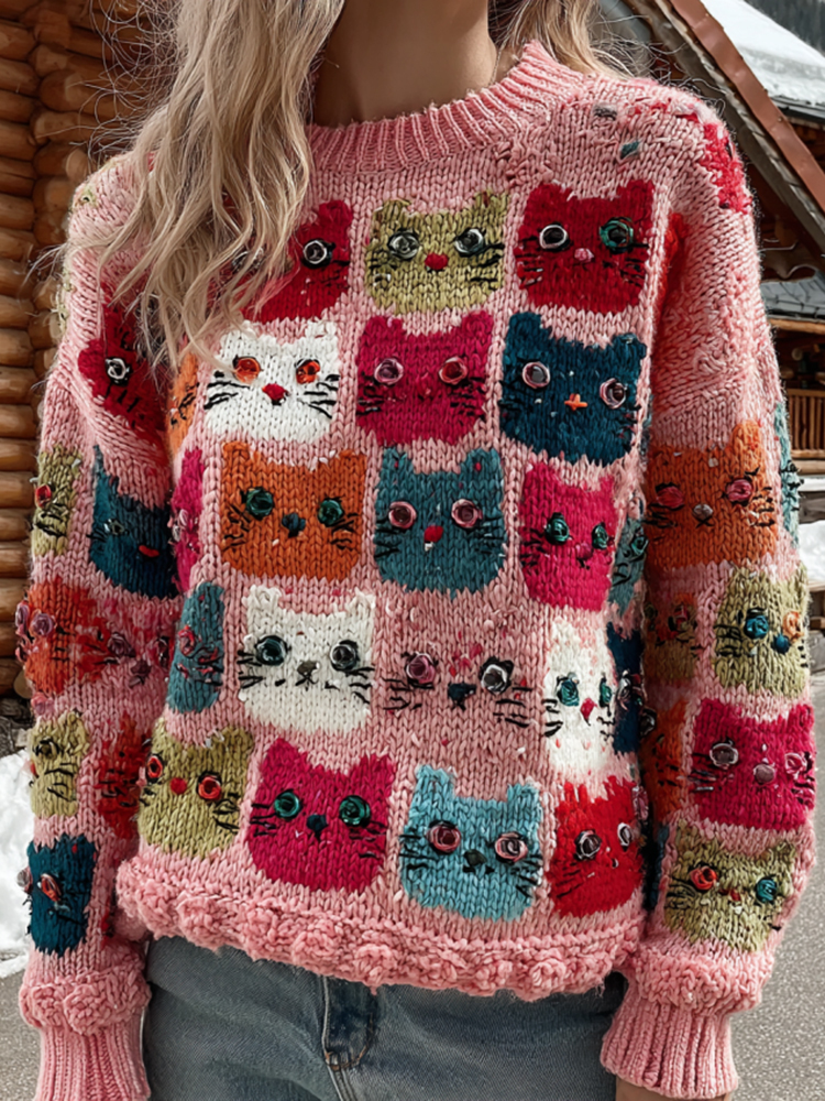 Colorful Winter Cats Pattern Art Cozy Knit Sweater