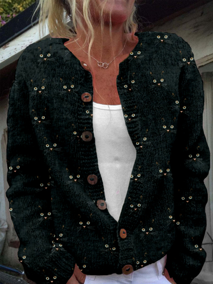 Cute Cat Face Pattern Cozy Knit Cardigan