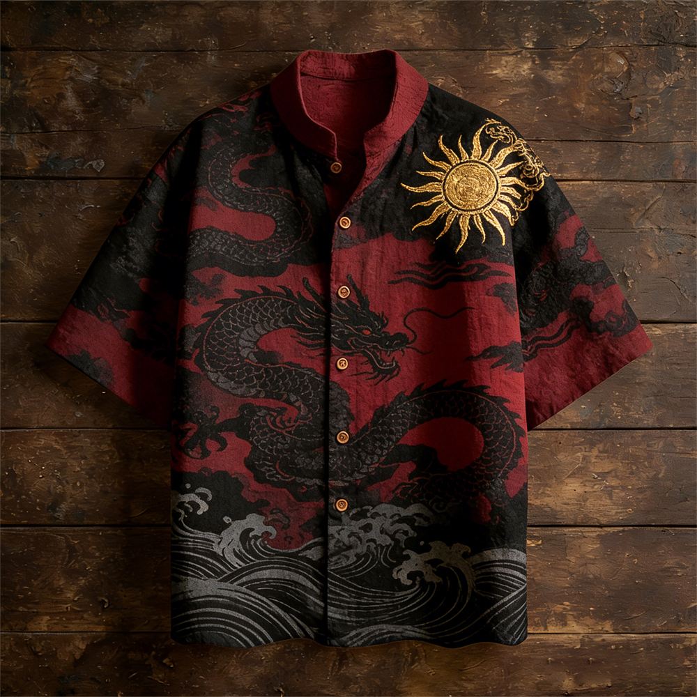 Japanese Ocean & Dragon Totem Men's Linen Short Sleeve Shirt