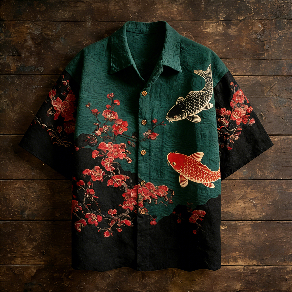 Japanese Plum & Carp Totem Vintage Men's Linen Short Sleeve Shirt