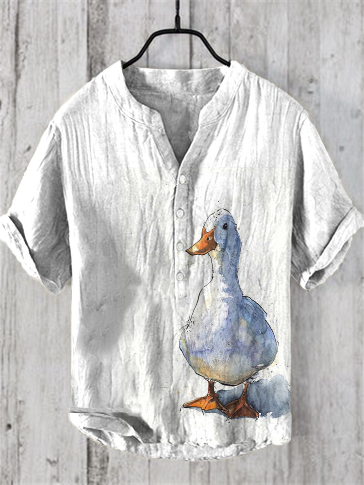 Men's Duck Art V Neck Button Cotton Linen Shirt
