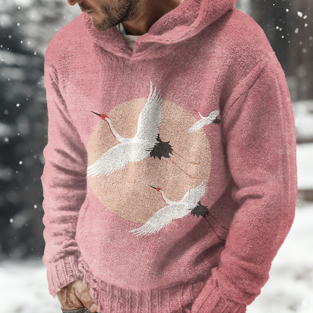 Men's Flying Cranes Japanese Art Pattern Cozy Knit Hooded Sweater