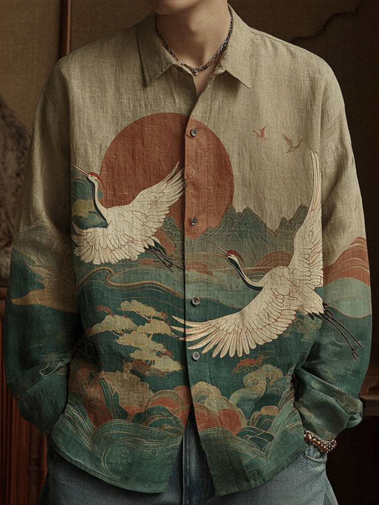 Men's Japanese-style Casual Shirt With Landscape And Crane Pattern