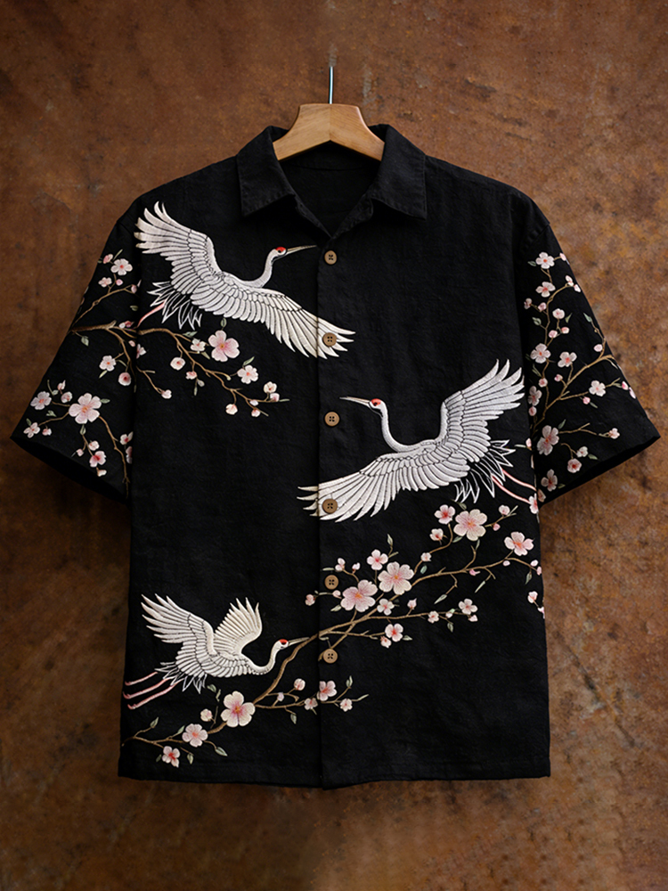 Men's Japanese-style Cherry Blossoms And Cranes Art Linen Short-sleeved Shirt