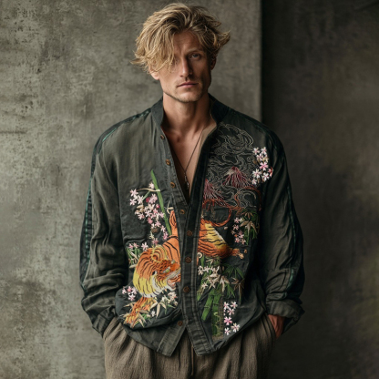 Men's Ukiyo Tiger Cherry Blossom Print Japanese Art Cotton-linen Shirt