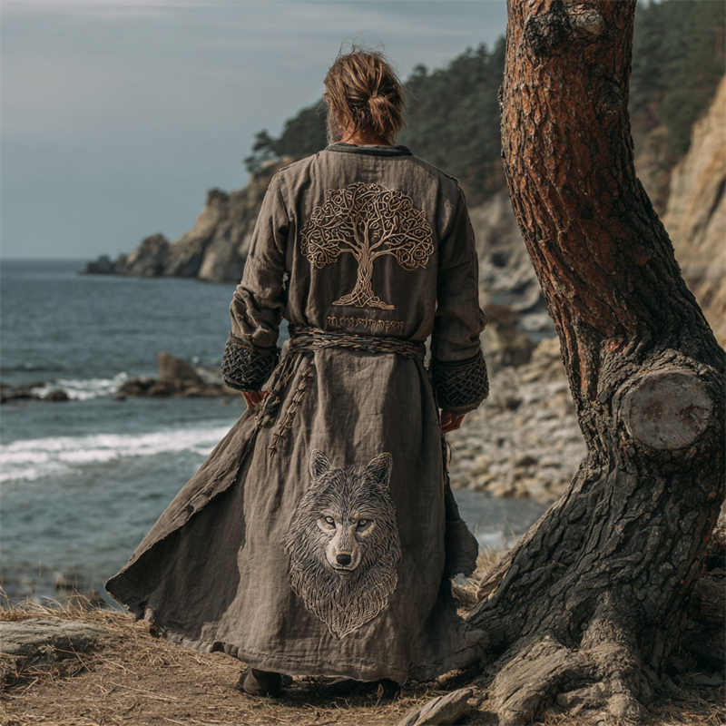 Men's Viking Tree Of Life & Wolf Celtic Linen Long Kimono