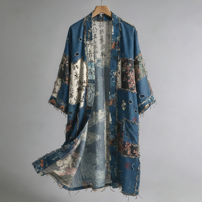 Retro Patchwork With Calligraphy And Floral Pattern Casual Linen Blend Kimono
