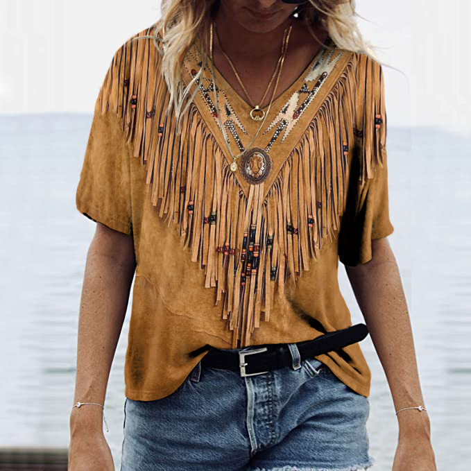 Women's Vintage Tassels Art V Neck Casual T-Shirt