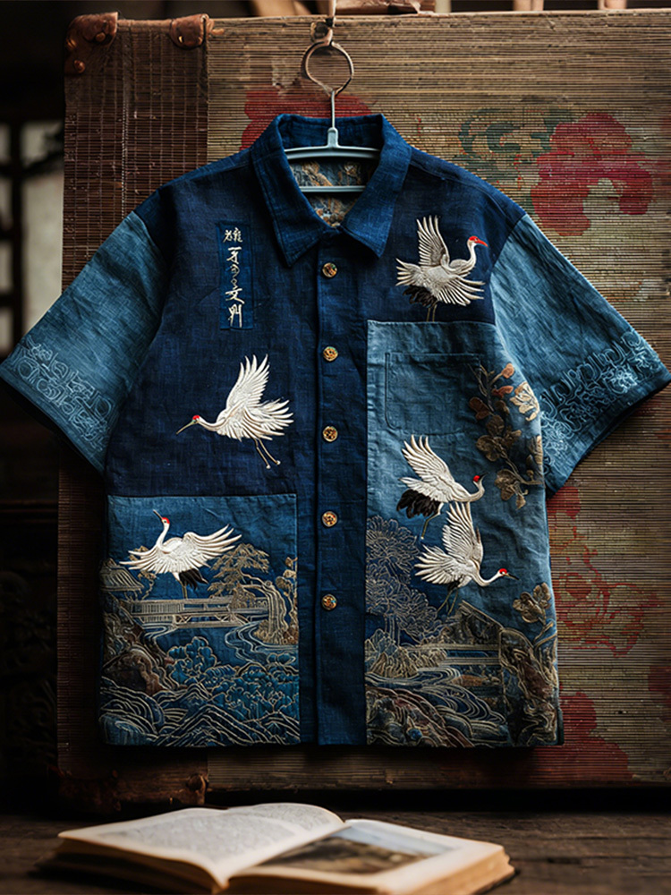 Japanese Style Crane With Landscape Patchwork Art Linen Short Sleeve Shirt