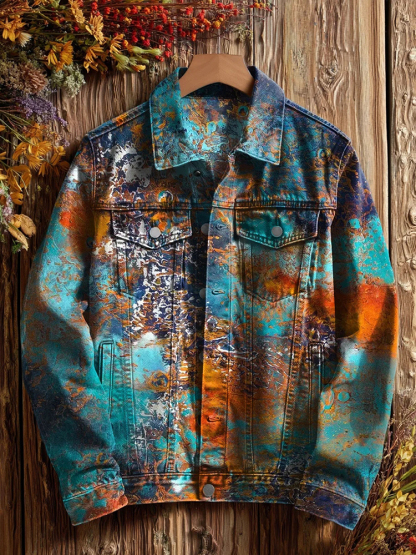 Men's Blue Gradient Abstract Art Print Casual Denim Jacket