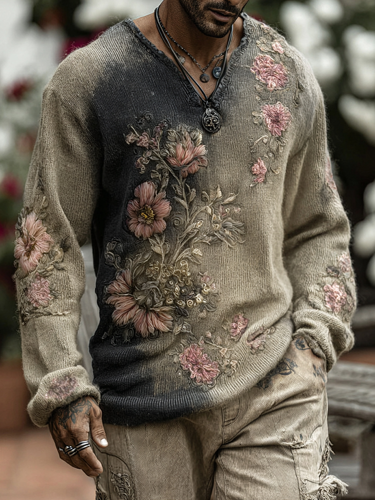 Men's Retro Floral Art Jacquard Thick Warm V Neck Sweater