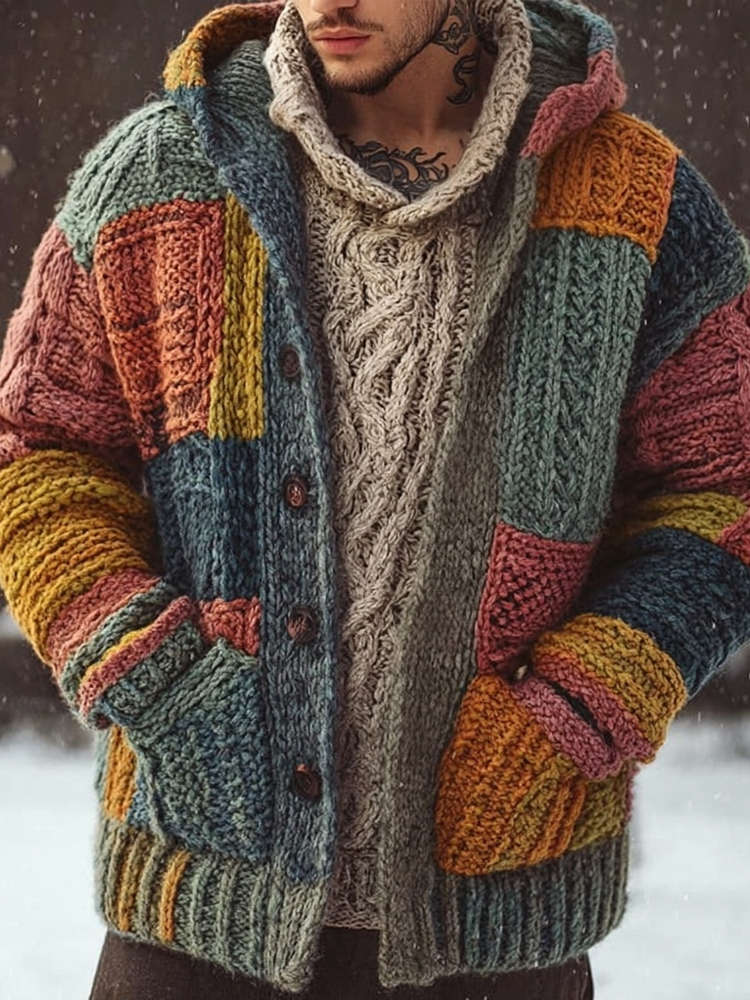 Men's Vintage Geometric Patchwork Chunky Hooded Cardigan