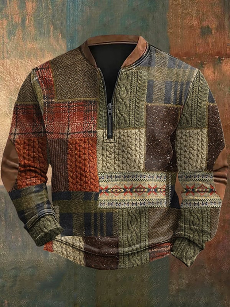 Men's Vintage Western Contrast Knit Print Zip Up Sweatshirt